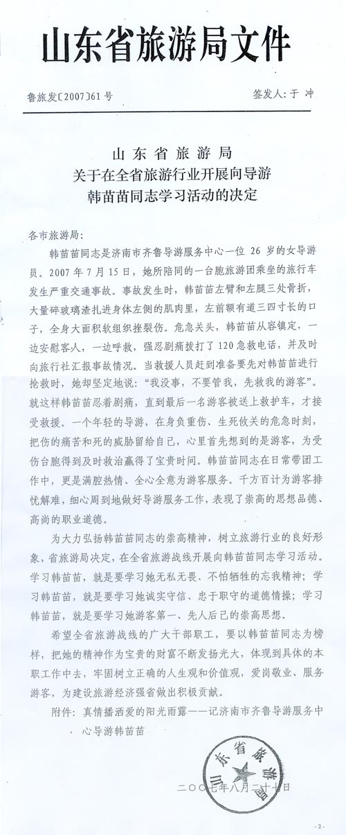 公告 山东省旅游局关于在全省旅游行业开展向导游韩苗苗同志学习的决定