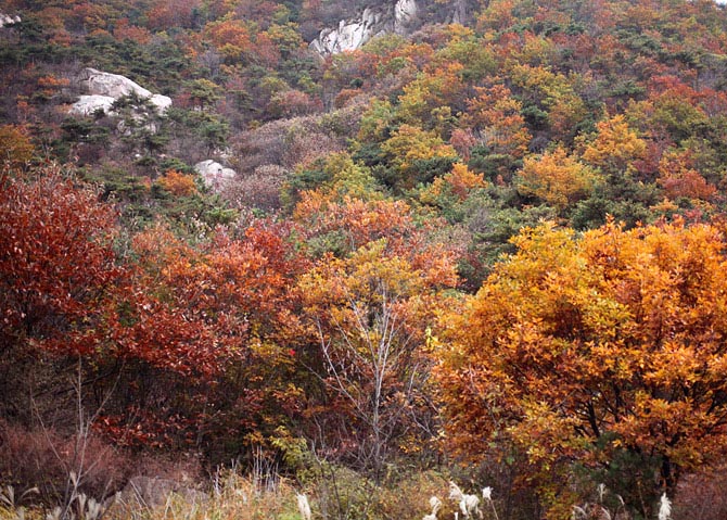 秋霜季节,五莲山满山红叶层林尽染,与山光石景相辉映,极为壮观,十分漂亮,真可谓霜叶红于二月花。
