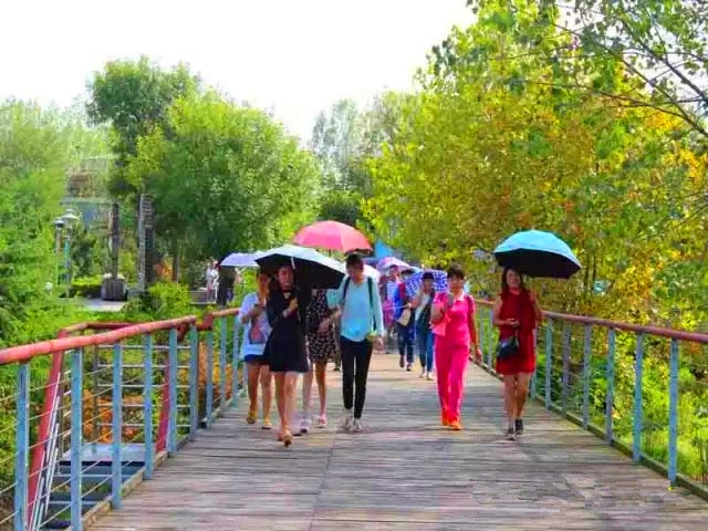 天空淅沥沥的下着小雨,游客游兴不减,纷纷撑伞游园。