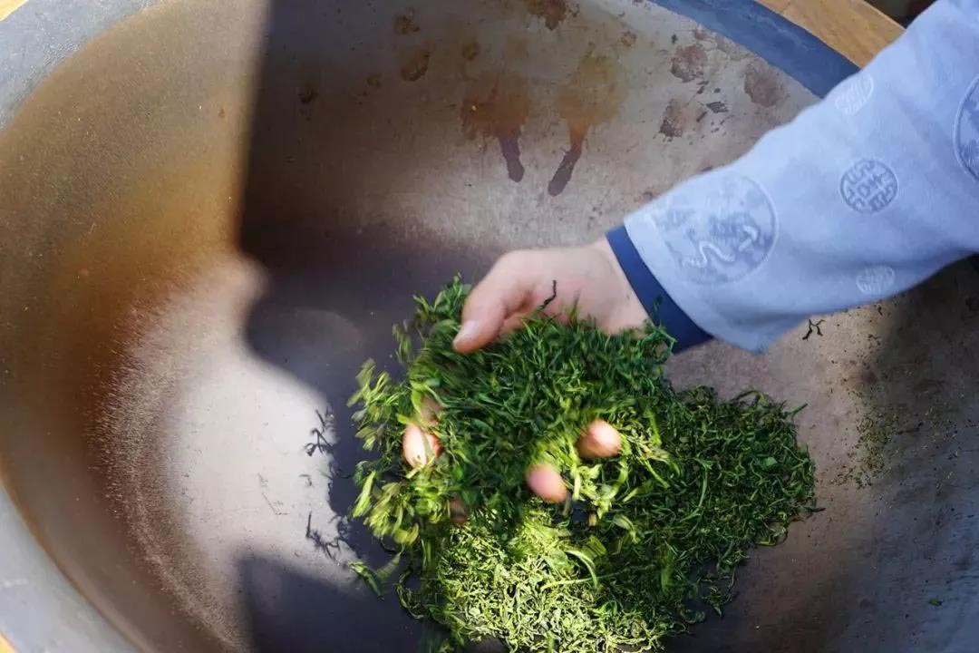 碧绿的茶叶翻飞舞动,茶香四溢。