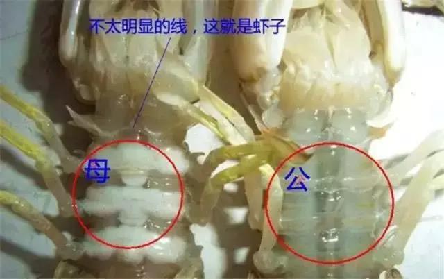 辨别公母:母虾腹部靠近头颈的位置有三条乳白色的横线,透过灯光可以看见母虾背部中间有一条明显的实线,这是红红的虾子映衬出来的颜色~而公虾通体一种颜色。