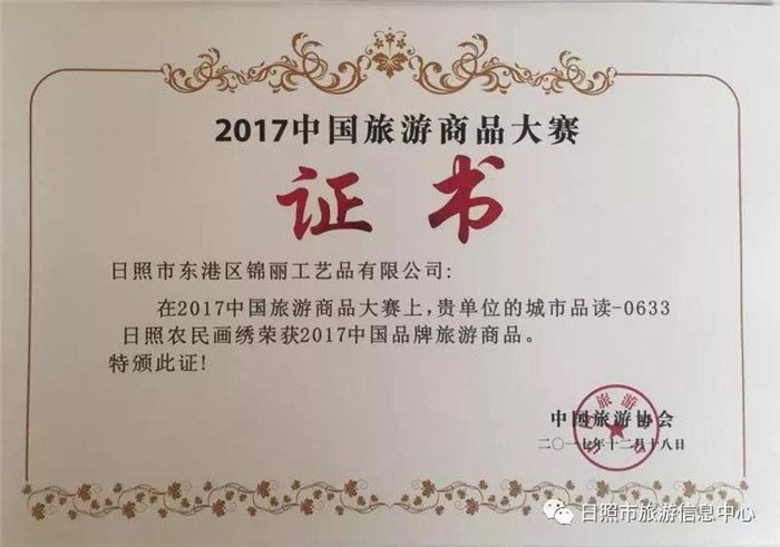 【城市品读-0633】日照农民画绣,自创始以来,公司系统性的规划了企业的战略发展规划,在品牌建立、市场营销、产品创新等方面,紧紧围绕市场需求,苦炼内功,积极参加国内大型国际性文化及旅游产业博览会,积极参加国际、国家省市的各类大赛,以大赛促创新、促宣传,在较短的时间内实现了由文化品牌向产业品牌转换,再由文化产业品牌向旅游商品品牌转换获得成功。