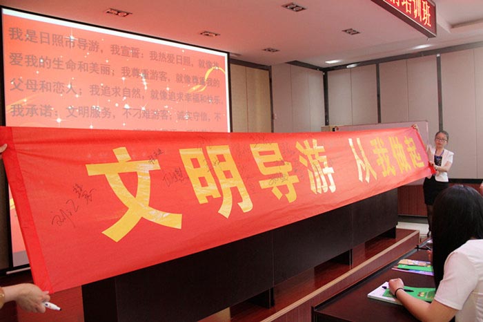 5月20日下午,119名新导游人员在2015日照市导游人员岗前培训班上诚信宣誓,并在“文明旅游,从我做起”横幅上郑重签下自己的名字,日照市旅游局副局长杨家坤参与宣誓活动。